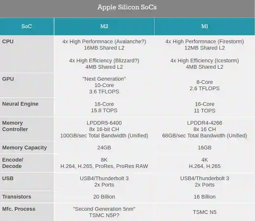 从更高的层面上看,M2 的更新程度有限:重点在于几个关键领域。虽然目前所有评价都是在苹果目前披露消息的基础上看的,但 M2 看起来仍然只是像 A15 的衍生品,类似于 M1 是从 A14 衍生而来的。因此,乍一看 M1 到 M2 的升级看起来与 A14 到 A15 的升级非常相似。