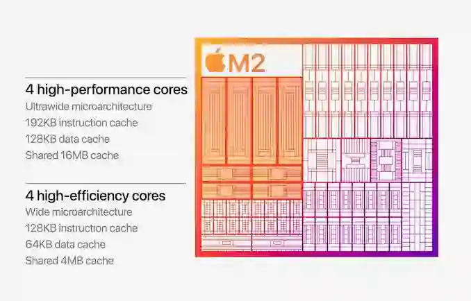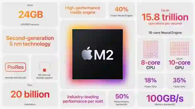 在 M1 最高端芯片 M1 Ultra 推出不到 3 个月的情况下,苹果就迫不及待地推出了第二代 SoC。M2 旨在取代苹果产品序列中的基础版 M1—— 它们最初被搭载于 13 英寸 MacBook Pro 和 MacBook Air 上,在此过程中,M2 进行了相当程度的重新设计。
