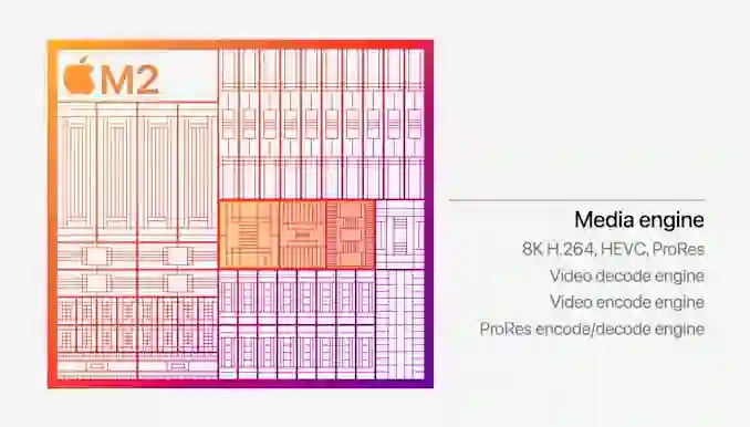 在显示方面,M2 还配备了新版视频编解码模块,其增加了对苹果的 ProRes 和 ProRes RAW 编解码器支持,苹果现在正式支持 M2 上的 8K 视频解码,而 M1 虽然从未有官方宣传,但本质上是 4K 级。