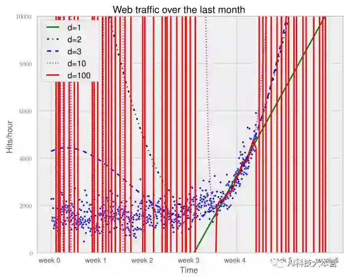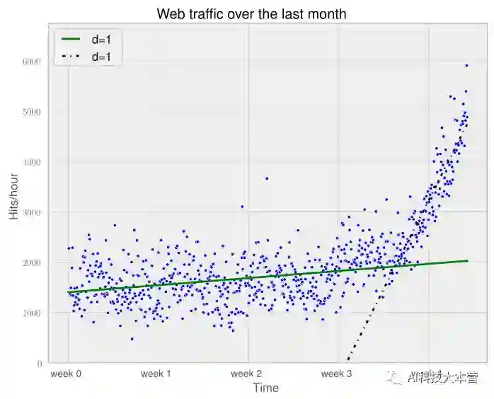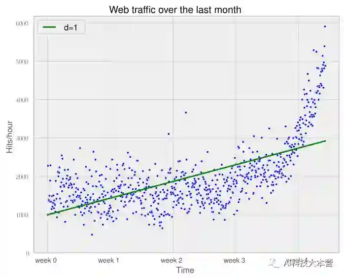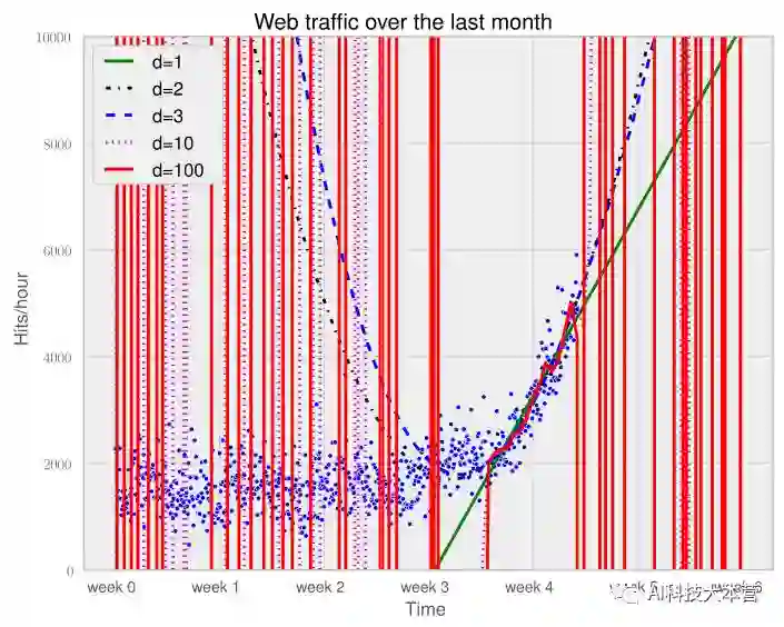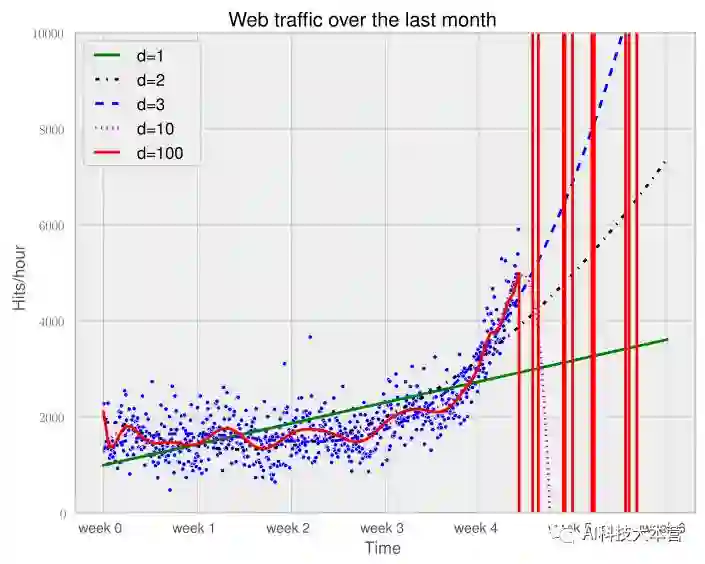 换一个方式来问,相比于其他复杂模型,为什么仅在最后一周数据上更相信拟合的直线模型呢?这是因为我们认为它更符合未来数据。如果在未来时间段上画出模型,就可以看到这是非常正确的(d=1是我们最初的直线模型)。