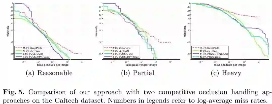 图5展示了本文算法与其他两个遮挡处理算法的对比结果,其中DeepParts就是将目标分成不同part分别进行打分的,可见本文算法的性能优势还是很明显的尤其是在严重遮挡子集上,当然本文算法在Reasonable子集的7.6的表现也是当前Caltech库上的state-of-the-art,论文中有图6为证,这里由于篇幅关系不再展示。
