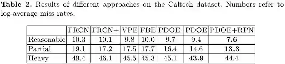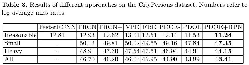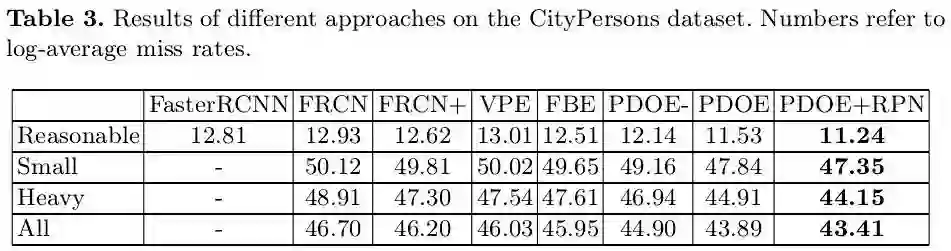 表2具体展示了本文各个贡献所带来的性能提升,FRCN代表最原始的Fast R-CNN;FRCN+则代表利用了本文的正样本选择机制,在heavy子集上的提升最为明显;VPE,FBE和PDOE分别代表利用可见部分估计分支、整体估计分支和融合两个分支得分的结果,PDOE-代表训练可见部分估计分支的回归目标时,负样本对loss没有任何贡献,可见PDOE在heavy子集上得到了最好结果,比FRCN提升了5.5个点;如果利用RPN来提取目标候选框并融合其得分,本文算法在Reasonable子集上得到了最好结果。