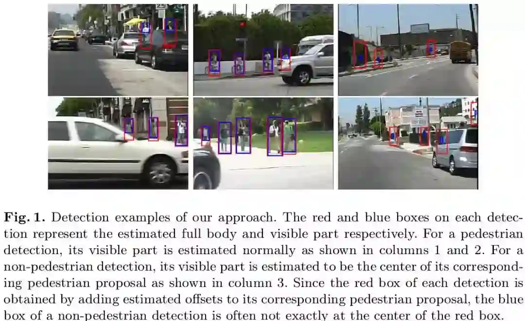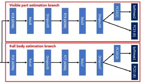 本文方法遵循Fast R-CNN检测框架。为了处理遮挡问题,本文提出利用一个网络同时进行行人检测和遮挡估计,具体而言就是让网络并行两个分支,分别输出两个bounding box,一个是完整的行人框,另一个时行人的可见部分,如下图1所示,前者为红色框后者为蓝色框,对于没有行人目标的候选框而言,则可见部分分支的输出要尽量逼近候选框的中心。