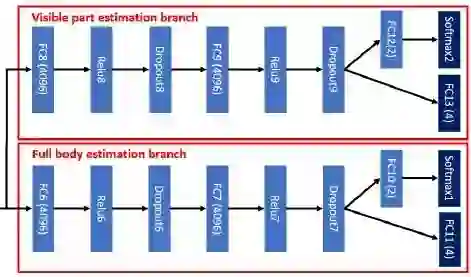 文中图2给出了本文算法的具体流程,基于Fast R-CNN检测框架,首先产生目标候选框,将图像和目标候选框输入卷积神经网络,然后通过RoI pooling提取每个目标候选框的特征,对这些特征进行分类和回归,分别得到两个box,图2中的绿色框代表行人目标整体,黄色框代表可见部分。文中图3给出了具体的网络架构示意图,其主要包括两个分支:可见部分估计分支和行人整体估计分支。