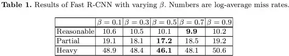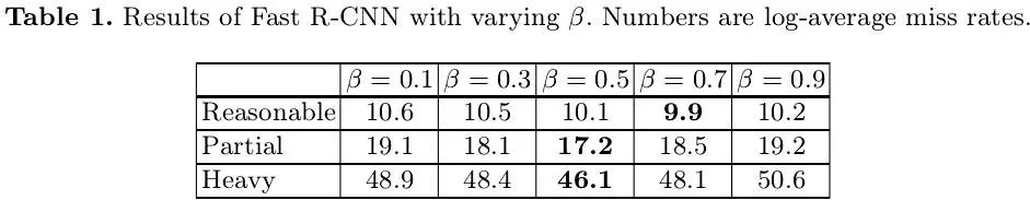 首先我们看下在Caltech上的验证实验,下表1展示了式(1)中的两个超参数在不同设定下的评估结果,其中heavy partial代表不同的遮挡程度,α设为固定的0.5,当β逐渐增大时,正样本的质量越高但也意味着正样本数量的降低,可见利用本文这套选择正样本的机制还是很有效的,尤其是在heavy子集上能提升2个点左右。
