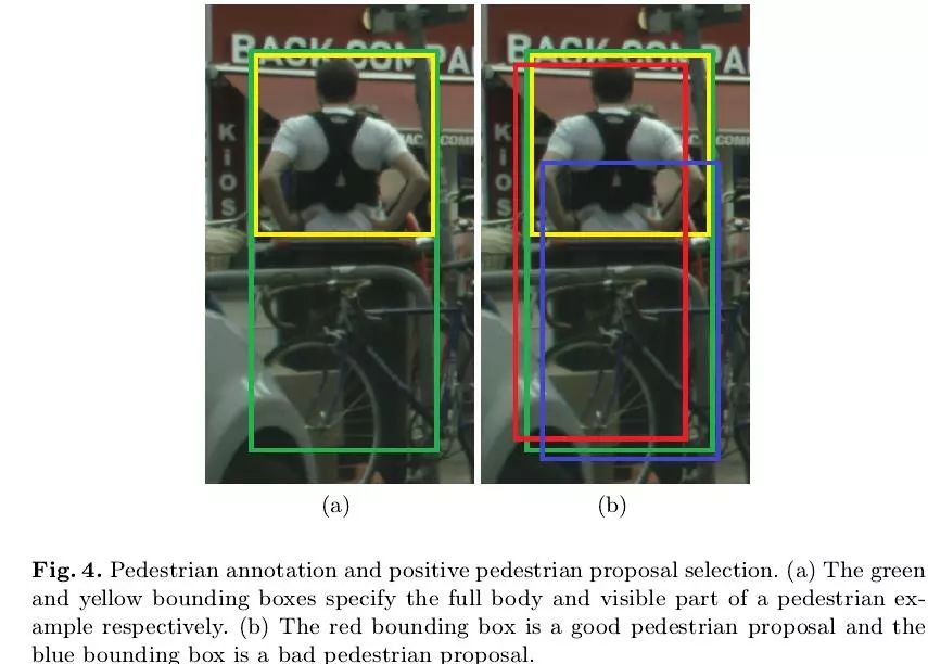 也即目标候选框P不仅要和整个标注框的重叠程度大于一定阈值,还要和标注框内行人可见部分的重叠程度大于一定阈值,这种设定正样本的方式显然是合理的,能够更有效地指导网络学习进而获得更强的特征判别力。以图4为例,如果和已有方法一样,只用式(1)中的第一个条件时,图(b)中的蓝色框也会被当成正样本,然而蓝色框中包含的目标信息非常有限,显然是会干扰网络的正常学习的,而如果加上式(1)中的第二个条件,则只有红色框才会被当成正样本。