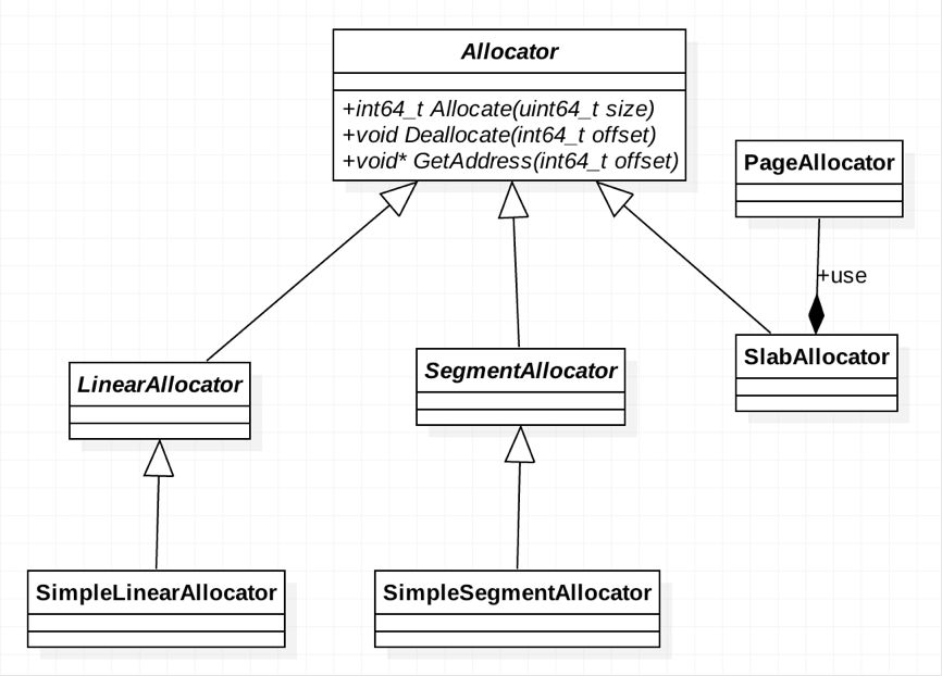 将存储层抽象为分配器(Allocator)。针对不同的内存使用场景,如对内存连续性的要求、内存是否需要回收等,可定制实现不同的分配器。