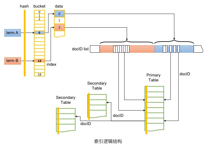 词典文件term:存储关键词、签名哈希、posting文件的偏移量和长度等。与Lucene采用的前缀压缩的树结构不同,在此实现为哈希表,虽然空间有所浪费,但可保证稳定的访问性能
