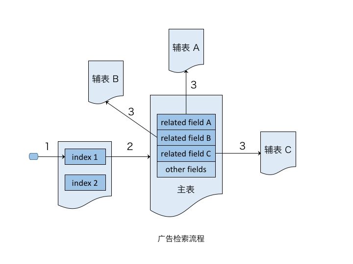 一般地,广告检索、排序等均基于广告组粒度,广告的倒排索引也是建立在广告组层面。借鉴关系数据库的概念,可以把广告组作为正排主表(即一个Adgroup是一个doc),并对其建立倒排索引;把广告主、推广计划等作为辅表。主表与辅表之间通过外键关联。