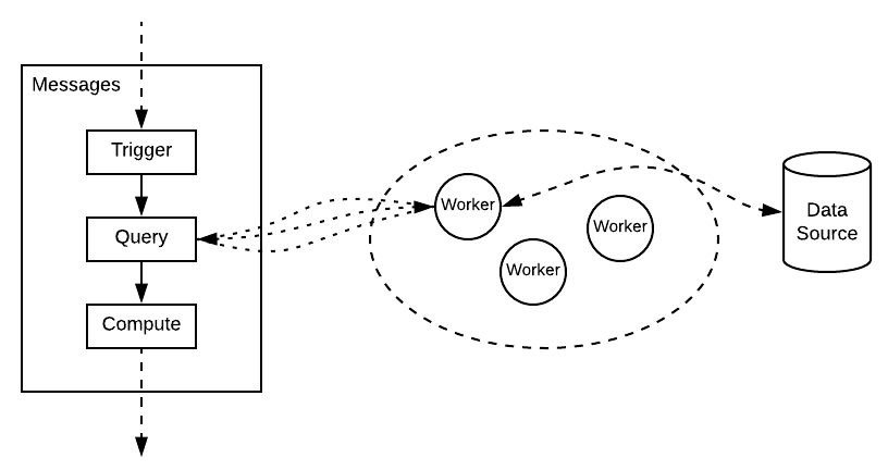 在此,采取经典的批量化方法,即集群内部,对于可以批量查询的一类数据源,全部收拢到一类特定的worker上来处理。在短时间内,worker聚合数据源并逐次返回给各个需要数据的数据流。处理一种数据源的worker可以有多个,根据同类型的查询汇集到同一个worker批量查询后返回。在这个划分后,就可以做一系列的逻辑优化来提升吞吐量。