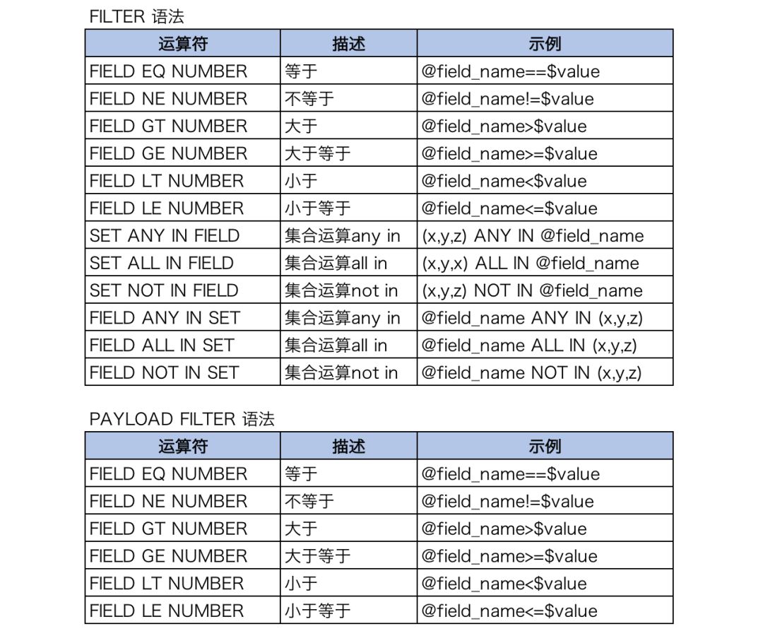 由Payload_filter参数定义Payload索引的过滤,目前仅支持单值字段的关系运算,多个键值对由“;”分割。