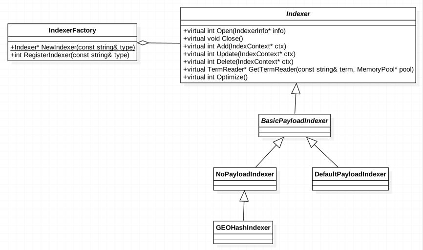 具体的Indexer仅需实现各接口方法,并将该类型注册到IndexerFactory,可通过工厂的NewIndexer方法获取Indexer实例,类图如下: