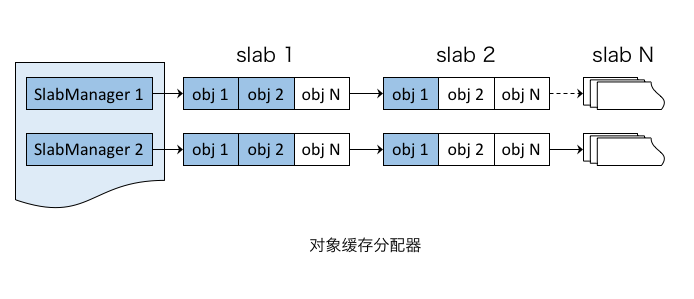 基于PageAllocator分配对象缓存,slab大小以页为单位