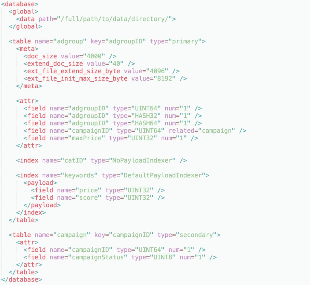 配置文件用于描述整套索引的Schema,包括Metadata、Table、Index的定义,格式和内容如下:
