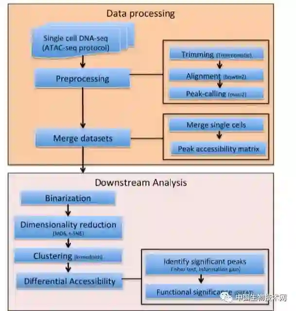 下图描述了完整的Scasat工作流程。首先是修整低质量碱基的预处理步骤,将读数与相应的基因组对齐并调用峰。然后通过合并每个单个单元的所有映射的BAM文件并在该合并文件中调用峰值来生成峰值可访问性矩阵。下游分析由对单细胞ATAC-seq数据进行统计分析的必要步骤组成。在Scasat中,数据被转换为二进制数据集。将维度减少方法应用于该二值化数据后,对该减小的维度进行其他统计分析以推断生物信息。