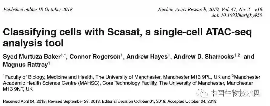 在2019年《Nucleic Acids Research》的第47期No.2中, 来自英国曼彻斯特大学的研究人员发表了单细胞ATAC-seq分析工具Scasat在细胞分类中的应用。
