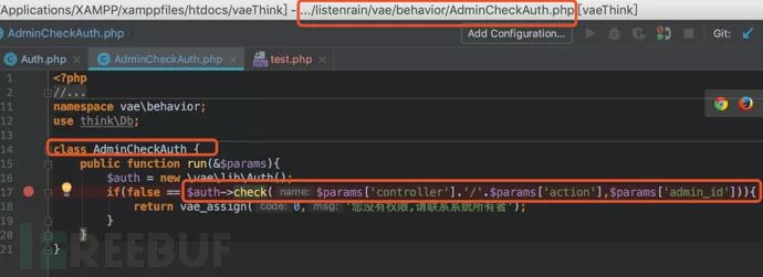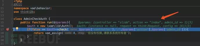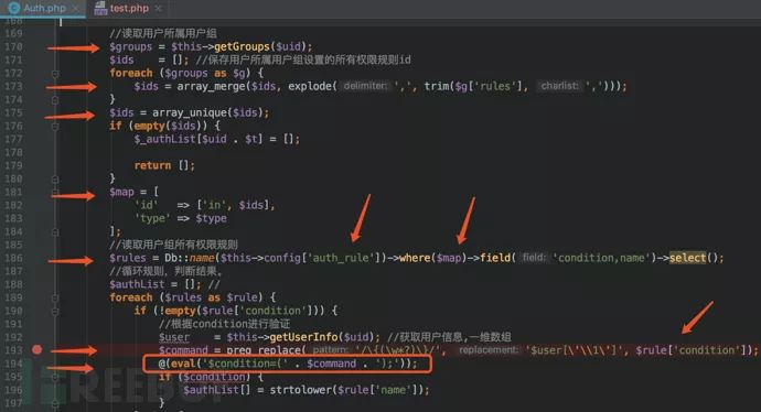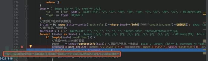在PHP中常见的代码执行函数有eval、system等等,通过command+shift+f进行全局搜索这些函数名关键词来找到切入点。经过一番排查,最终定位到了一个比较可疑的地方listenrain/vae/lib/Auth.php第194行中的getAuthList函数:
