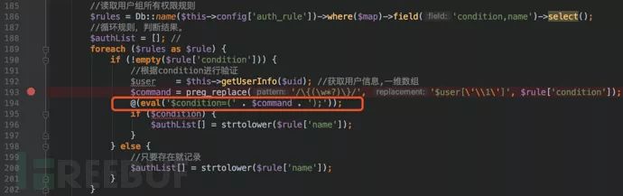 分析后可以确定,数据库中用户拥有的权限对应的规则的condition字段将会作为eval()的参数被执行