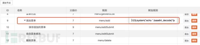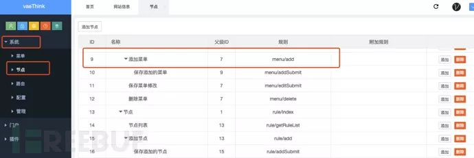 接着继续确定数据表中的condition字段是否为用户可控,分析后可以发现,在后台的系统/节点 [http://127.0.0.1/index.php/admin/rule/index.html](http://127.0.0.1/index.php/admin/rule/index.html)页面中存在对该数据表的操作功能,而附加规则对应数据表中的condition字段: