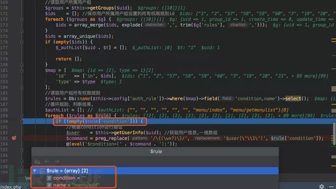 $rule是从186行 $rules = Db::name($this->config['auth_rule'])->where($map)->field('condition,name')->select();数据库中查询得到的数据的一部分。从作者的注释可以看到,读取的是用户组所有权限规则。