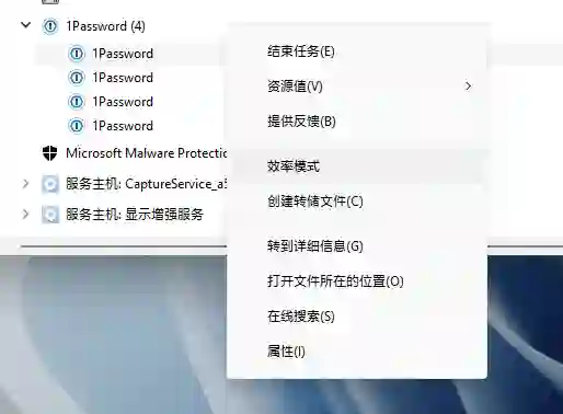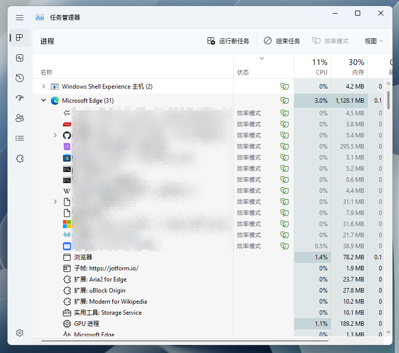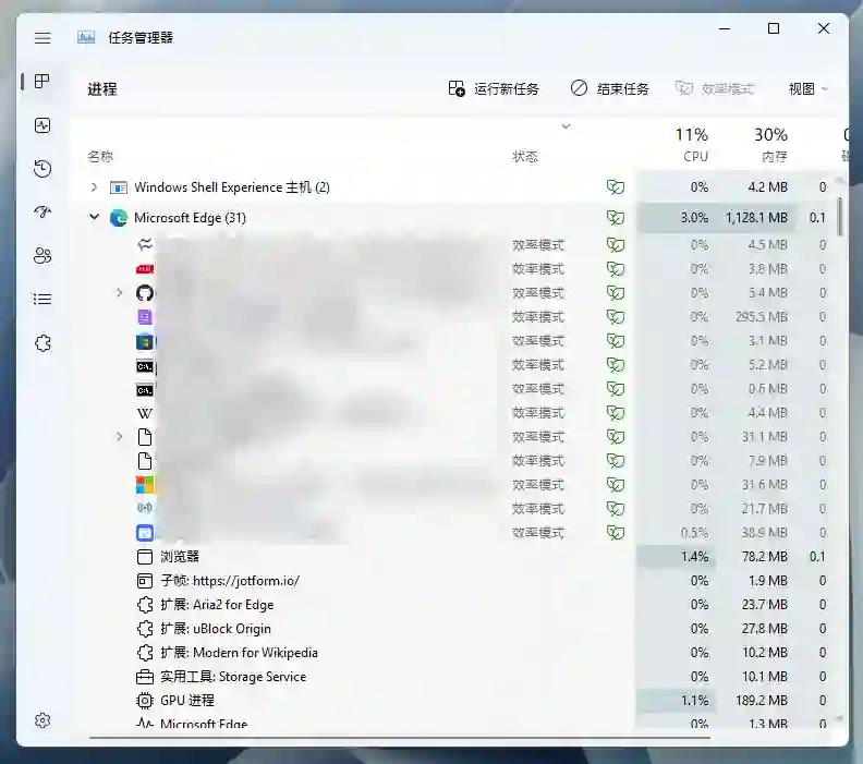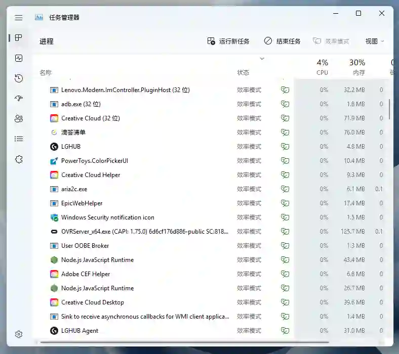这也就导致我们打开 Windows 的任务管理器之后,能看到的、开启了 EcoQoS 效率模式的应用寥寥无几。
