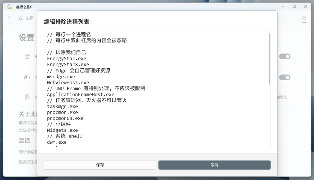 同时,「能源之星 X」又允许我们根据实际情况自定义:在主界面右上角的齿轮设置中找到「编辑排除进程列表」,然后将需要排除的进程名称直接填入并保存即可生效。