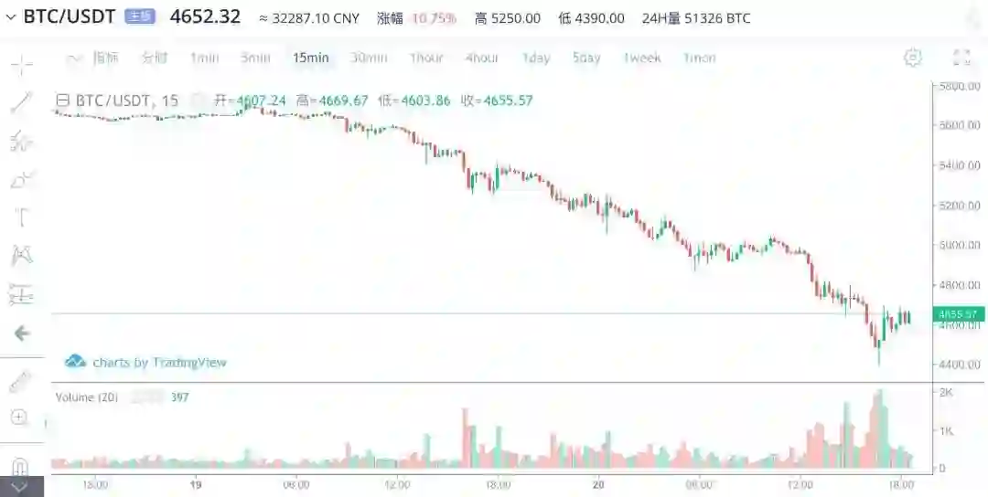 5:00,比特币跌破5000美元。16:45,比特币曝出当日最低价——4390美元。