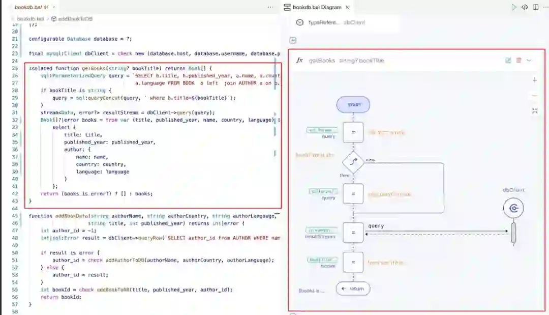 因为存在多个实体之间的交互,所以集成用例就变得很复杂。因此,理解整个流程和顺序对于维护、改进和解释场景来说至关重要。Ballerina 内置了图表功能,可以基于已编写的代码生成完整的序列图。图表可以作为代码的文档,相比直接阅读源代码,这种方式更易于理解程序。你可以使用 Ballerina VSCode 插件查看和编辑这些图表。