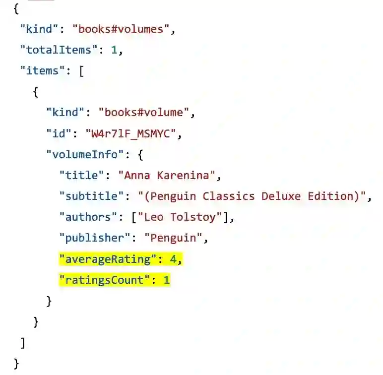接下来创建用于表示从 Google Books API 获取到的数据的记录类型。在创建所需的记录之前,需要分析一下根据指定 ISBN 从 Google Books API 获取的的 JSON 响应消息的格式。它返回一个 JSON 对象,其中包含了一个“items”的数组。它还有另一个叫作“volumeInfo”的对象,这个对象包含了与书籍评论相关的信息,字段名分别为“averageRating”和“ratingsCount”。