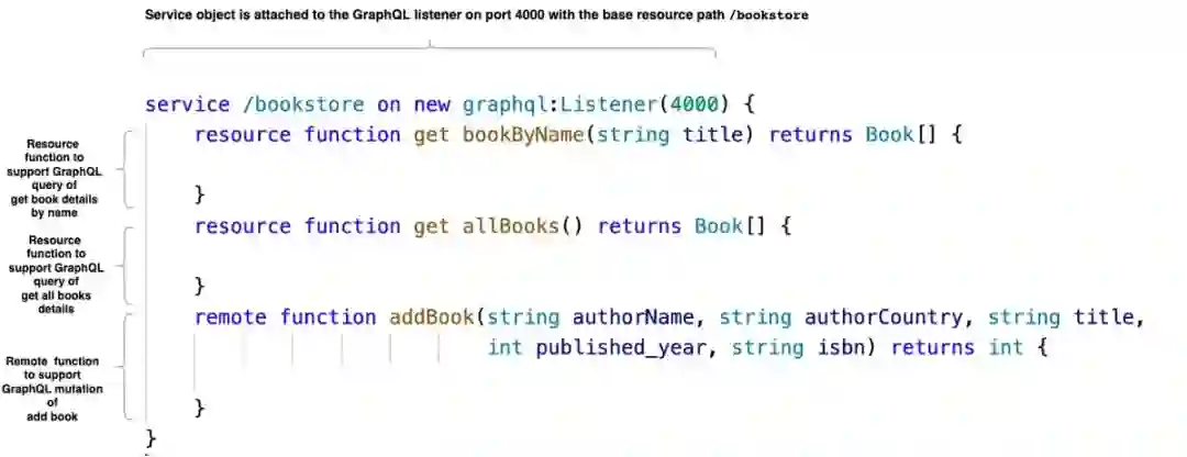 service /bookstore on new graphql:Listener(4000) {resource function get bookByName(string title) returns Book[] {return getBooks(title);}resource function get allBooks() returns Book[] {return getBooks(());}remote function addBook(string authorName, string authorCountry, string title,int published_year, string isbn) returns int {int|error ret = addBookData(authorName, authorCountry, title, published_year, isbn);return ret is error ? -1 : ret;}}