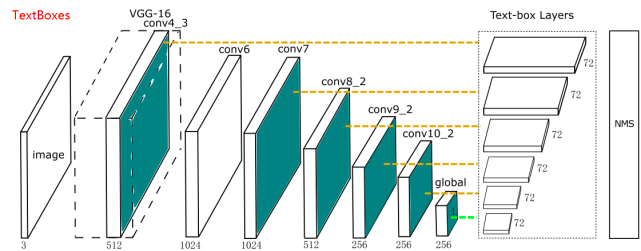 TextBoxes共有28层卷积,前13层来自于VGG-16(conv_1到conv4_3),后接9个额外的卷积层,最后是包含6个卷积层的多重输出层,被称为text-box layers,分别和前面的9个卷积层相连。由于这些default box都是细长型的,使得box在水平方向密集在垂直方向上稀疏,从而导致该模型对水平方向上的文字检测结果较好。