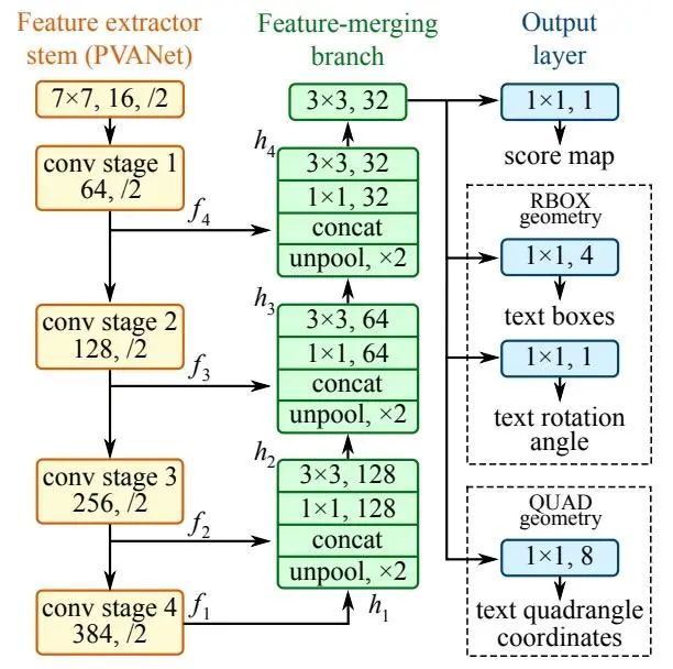 EAST算法借助其独特的结构和简练的pipline,可以检测不同方向、不同尺寸的文字且运行速度快,效率高。