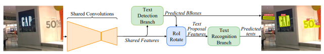 目前,基于深度学习的场景文字识别主要包括两种方法,第一种是分为文字检测和文字识别两个阶段;第二种则是通过端对端的模型一次性完成文字的检测和识别。