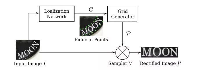 定位网络:针对输入图像预测N个变换矩阵,相应的输出N个文本区域,最后借助双线性差值提取相应区域;