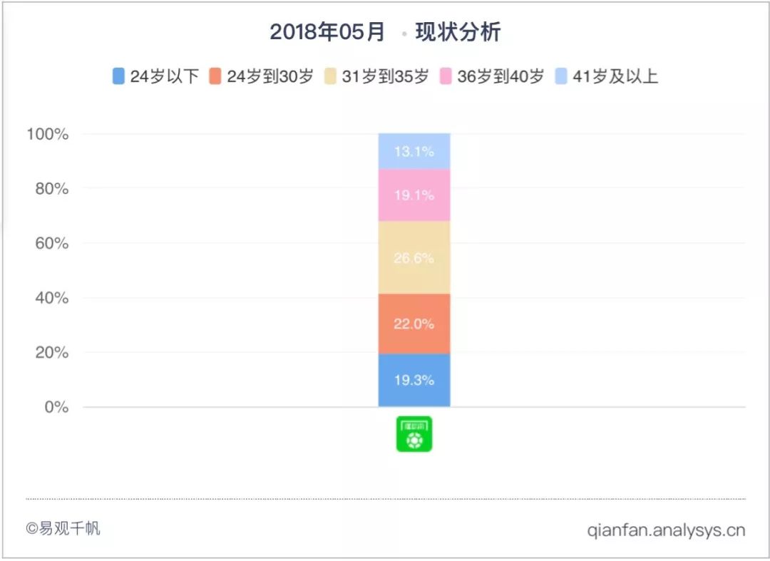 在年龄分布上,2018年5月,31岁到35岁用户占比26.6%居首,24岁到30岁用户占比22.0%紧随其后,24岁以下年轻用户和36岁到40岁用户占比均在19%左右。