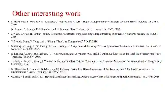 上图列出了一些最近的其他目标跟踪工作,比如人眼跟踪、人脸跟踪以及行人跟踪等等。