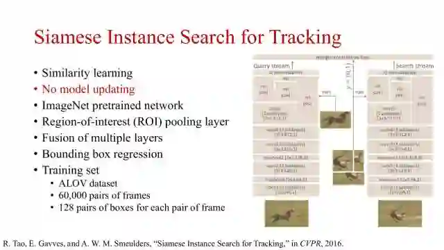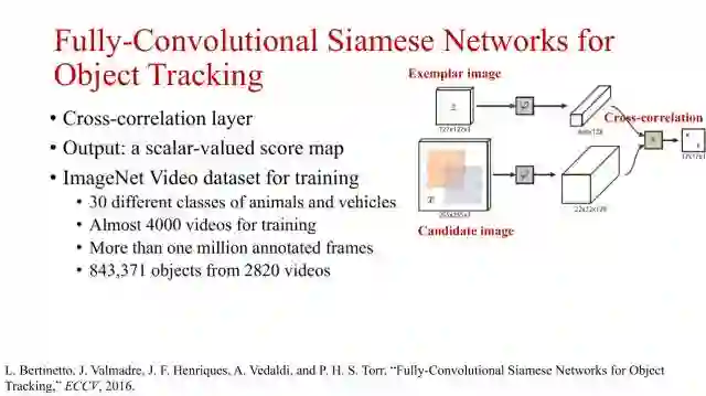 CVPR2016上提出了一种通过相似性学习的方式进行目标跟踪的孪生网络。其最大的特点是,该方式训练好的网络直接在跟踪上使用,不需要更新。网络同样采用了不同层的特征融合和边框回归来提升目标跟踪的性能。