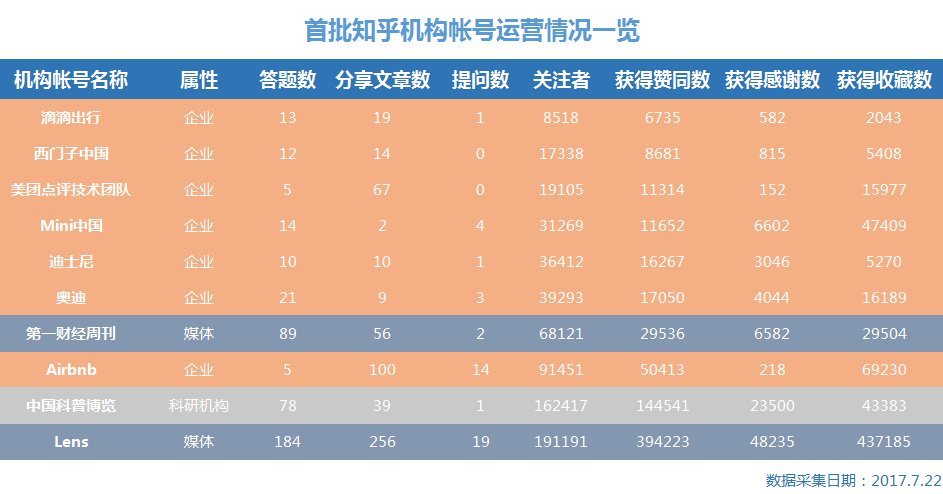让企业帐号担当主力,一度被理解为是知乎向商业机构伸出的橄榄枝。然而,一年时间过去,这七家企业的知乎机构帐号普遍都不理想。