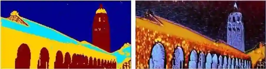 这篇文章的作者认为,目前的前馈网络之所以每次只能描述一种风格,是因为这些网络并没有完全将图像的内容和风格区别开来。为了解决这个问题,作者借鉴了传统纹理合成方法中纹理基元(texton)的概念,将纹理基元通过深度网络学习并存储在滤波器组中,作者称之为风格库(style bank),每类风格生成一个与之对应的风格库。在前向传播时,只需选择需要的风格库,就能完成指定风格的迁移,结合了快速和风格多样化两种优势。这些风格库建立在自编码器提取的特征空间基础上,能更好地描述每类风格。同时,自编码器与风格库的结合还具有易于扩展的优势:对于新的风格,只需要训练新的风格库,不必重新训练整个网络。最后,因为内容与风格有效分离,训练得到的自编码器能对图像内容进行有效的区域划分,实现了基于区域的风格化。 图2.左:编码得到的feature map的聚类结果。右:风格化结果。 图3. 两种风格的融合。