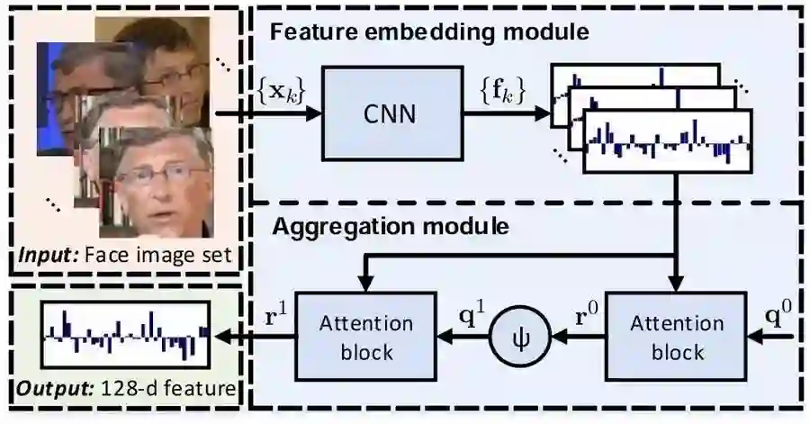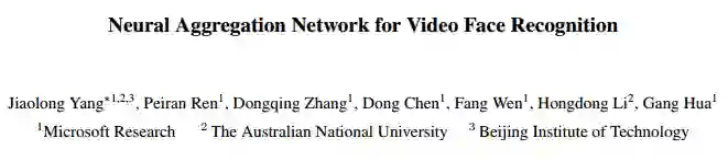 本文提出了一种用于视频人脸识别的神经聚合网络(Neural Aggregation Network,NAN)。网络将一个人脸部的视频或者一组数量不同的脸部图像数据集作为输入,并且生成一个紧凑(compact)、维度固定的特征表征,可用于识别。整个网络由两个模块组成。特征嵌入模块是一个深度卷积神经网络(CNN),它将每幅人脸图像都映射成一个特征向量。聚合模块由两个注意力模块(attention block)组成,它们能够自适应地聚合特征向量,在它们所覆盖的凸包(convex hull)中形成单个特征。由于注意力机制,聚合不会因图像顺序的变化而发生改变。我们的 NAN 由一个标准分类或验证损失训练,没有接收任何额外的监督信号,但我们发现它能够自动学习优选(advocate)高质量的脸部图像,同时排除(repel)低质量的图像,比如模糊、有遮挡和姿态不端(improperly exposed)的面部图像。在 IJB-A、YouTube Face、Celebrity-1000 视频脸部识别基准测试的实验表明,NAN 始终优于朴素聚合方法,并且实现了当前最高的精度。