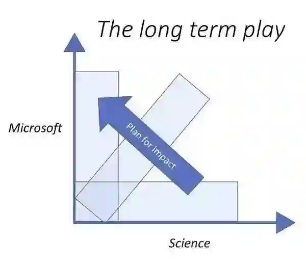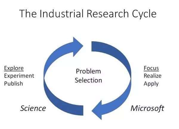 微软研究院不仅为你提供了如学术界一样充分探索和增进科学知识的自由,也需要你将自己的科学追求与公司的问题结合起来,致力推动微软的发展,这一要求也会随着你的年资增长而提高,这也反映了微软研究院在推进科学前沿研究的同时也要给公司带来正向推动的双重使命。 Thomas Ball写道:“[微软研究院的]研究人员可以自由地选择研究问题,并在各自学科(周期的左侧)探索,从而推进科技的进步。同时,他们也有责任和机会在进行了充分探索后,将注意力集中在他们认为可能对公司(周期右侧)产生影响的领域。理想情况下,研究人员对科学研究问题解决方案的探索最终会对公司的技术应用产生影响。”