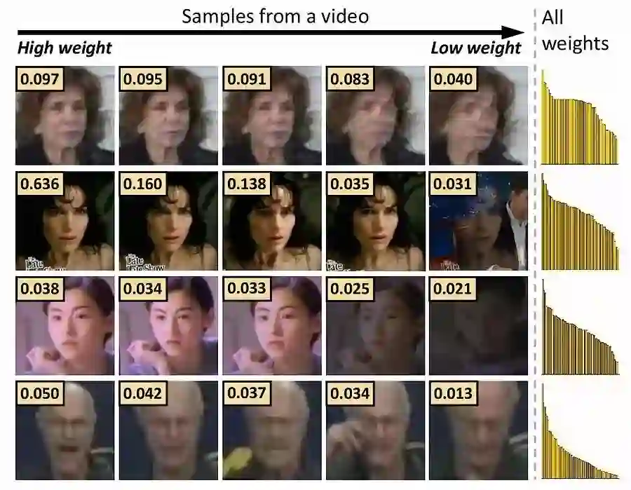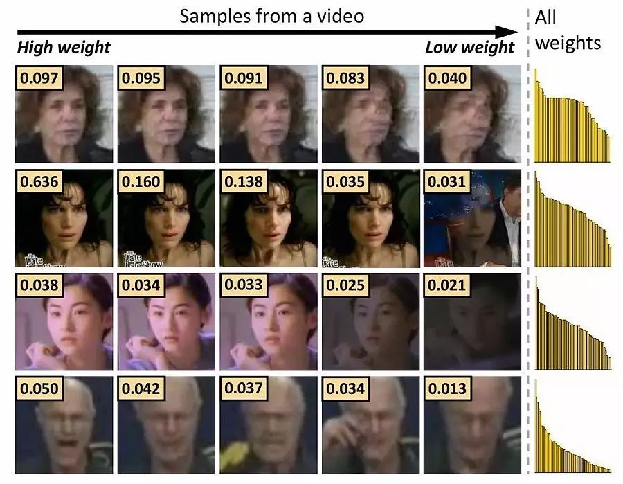 图6. YTF数据集上的典型示例,显示了我们的NAN计算的视频每帧的权重。每一行表示从视频采样5个帧,并根据其权重(图片左上角矩形中的数字)进行排序; 最右边的条形图显示所有帧的排序权重(高度缩放)。