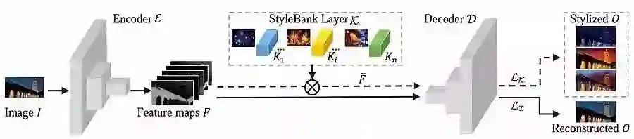 网络分为三个部分:编码器E、解码器D和风格库(style bank)K。输入图像I经过编码器编码为特征图(feature map)F,接着分为两路:下侧的实线箭头代表自编码器支路,F不经过风格库处理,直接经过解码器解码,得到O,O应该与I相似;上侧的虚线箭头代表风格化支路,F经过代表第i种风格风格库Ki滤波后得到特征图Fi,再经过D解码为风格化后的结果Oi。 图1. 网络分为3部分:编码器E、风格库K和解码器D。
