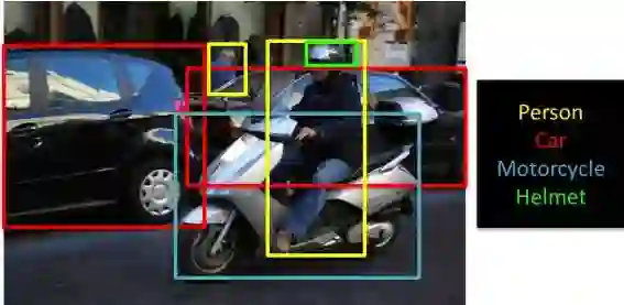 在第二个例子中,有若干物体:汽车、人、摩托车和头盔。