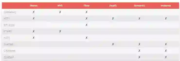 有了公共排行榜,大家只需要比较多种方法的结果,就很容易追踪到这一领域的最先进技术。虽然目前在每个数据集上都取得了稳定的进展,但许多都只限于特定领域。例如,KITTI 专注于真实世界的城市驾驶场景,而 Middlebury 考虑的是室内场景。