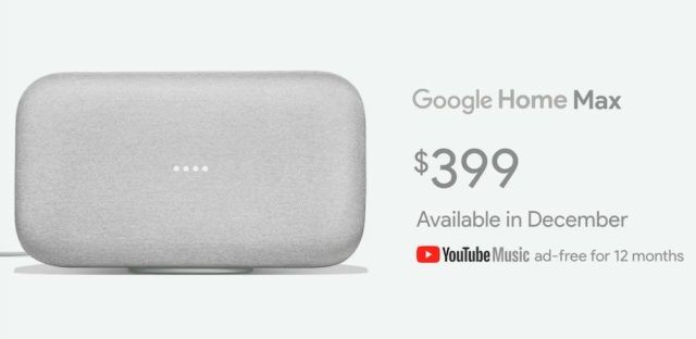 Google Home Max 支持蓝牙与 Google Cast,将与 12 月发售,要价 399 美元。