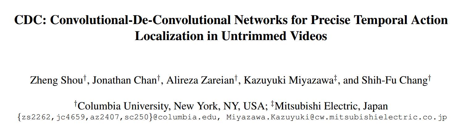 去年,寿政所在小组——“数字视频多媒体实验室”的论文“Segment-CNN:Temporal Action Localization in Untrimmed Videos via Multi-stage CNNs”也被 CVPR 2016 收录,该论文应用端到端的深度学习方法进行了初步尝试。今年,也就是他们 CVPR 2017 的工作,则尝试了新型的卷积逆卷积(CDC)网络。