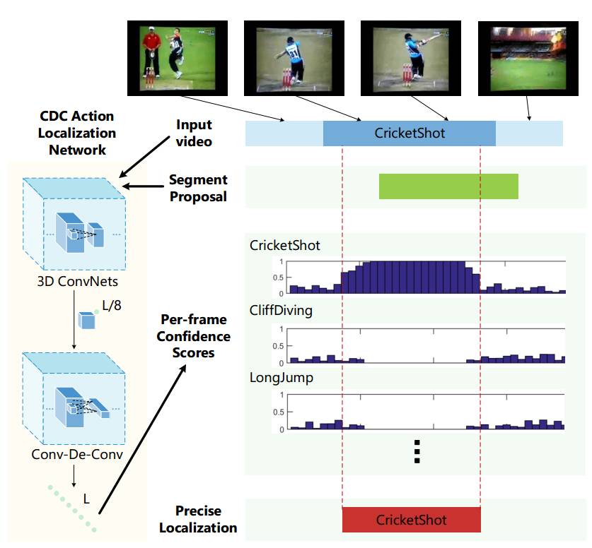 给定一段原始输入视频,将其输入到我们的 CDC 定位网络中,其中 3D 卷积神经网络用于提取语义,新型 CDC 网络用于对密集的帧数级分数作出预测。结合此类粒度级分数序列和候选视频片段(segment proposals),对动作实例的时间边界进行精确识别。