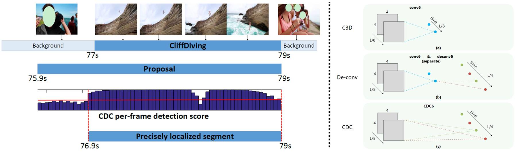 我们使用自行设计出的 CDC 过滤器构建了一个 CDC 网络,专门用于对时序动作进行精确的定位。可以使用原始视频对该 CDC 网络进行高效的端对端训练,以得出密集的分数,用以预测动作实例的精确时间边界。